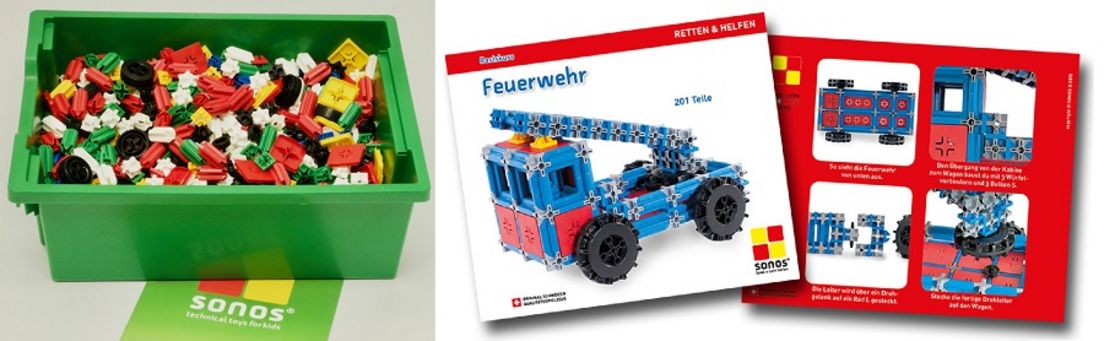 Neu sind die SONOS Projekt-Karten. Diese zeigen verschiedene Ansichten von typischen Baumodellen, wie z.B. Traktor, Feuerwehr oder Flugzeug. Die Projekt-Karten erleichtern den Jüngsten den Einstieg in die kreative Bau-Welt von SONOS. Gleichzeitig werden die Kinder dazu angeregt, ihren eigenen kreativen Weg zu beschreiten.