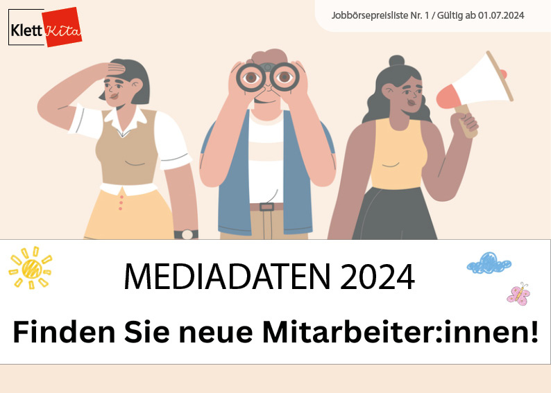 Sie sind auf der Suche nach Erzieher:innen, Kitaleitungen oder Auszubildenden in Kindergärten, -tagesstätten, sonderpädagogischen Einrichtungen, Horten und Ausbildungsstätten? Dann schalten Sie über unserer Klett-Kita-Jobbörse Ihre Stellegesuche und profitieren Sie von unserer Reichweite!
