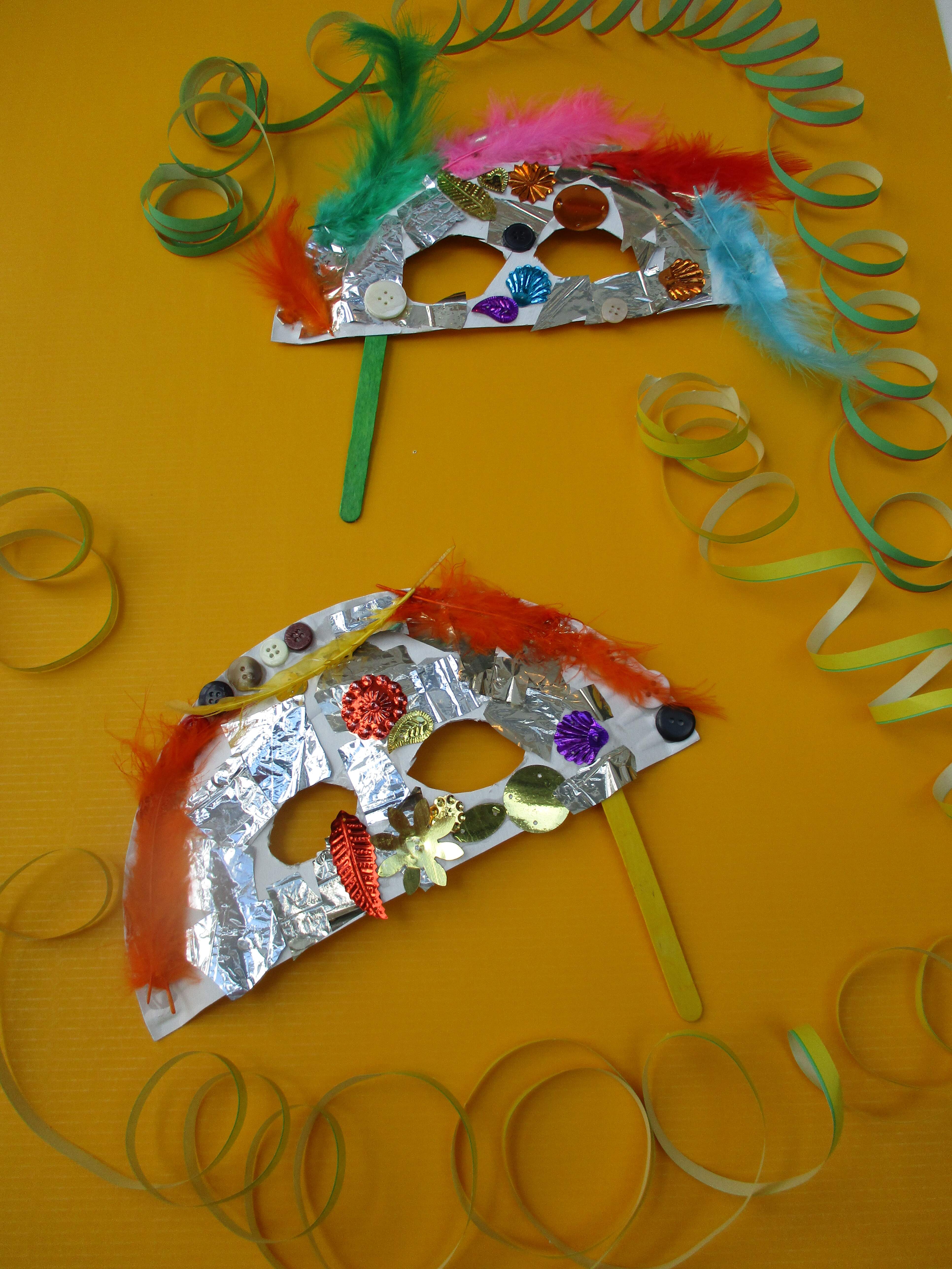Halbiere den Teller und schneide mit der Schere zwei Augen auf einer Hälfte aus. Klebe das Eisstäbchen an die Tellerseite als Haltegriff. Verziere die Maske mit Glitzer, Federn, Steinchen, Farben etc. und verkleide dich damit!