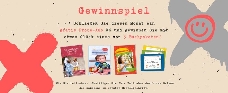 Das dieser Sendung beiliegenden Einstiegsangebot erhalten Sie für nur € 0,00 und ohne Versandkosten. Erfolgt innerhalb von 14 Tagen nach Erhalt der Sendung keine schriftliche Abbestellung (per Post oder per Mail an: kundenservice@klett-kita.de), tritt das Abonnement (4 Ausgaben pro Jahr je 24,90 € zzgl. Versandkosten) in Kraft. Das Bezugsjahr beginnt mit dem Datum der ersten Rechnung. Eine Kündigung ist bis 6 Wochen vor Ablauf des Bezugsjahres möglich.