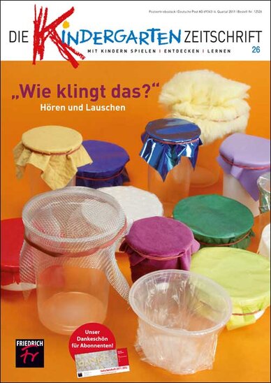 Hören bedeutet, die Welt der Klänge und Töne und die der Sprache zu entdecken. Schönes hören, Geräusche erzeugen, Krach machen, Stille erleben – und auch mit anderen im Dialog sein: Alles das sind grundlegende Welterfahrungen, die Kinder in den ersten Lebensjahren ganz besonders brauchen und die ihnen in der Kita auf vielfältige Weise ermöglicht werden können.