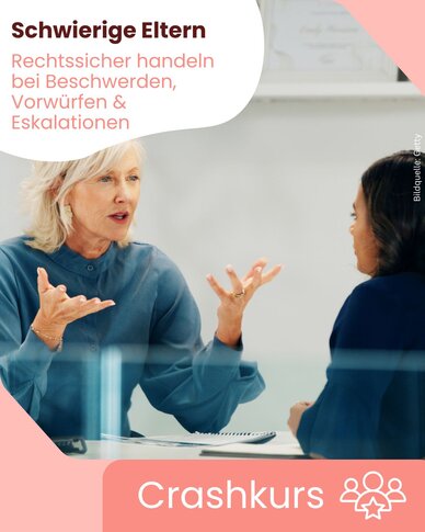 Beschwerden, Vorwürfe und eskalierende Situationen mit Eltern gehören zu den besonders herausfordernden Aufgaben im Kita-Alltag. Dieser LIVE-Crashkurs vermittelt Dir kompaktes, praxisnahes rechtliches Grundlagenwissen, um in schwierigen Elterngesprächen sicher, professionell und rechtssicher zu handeln.